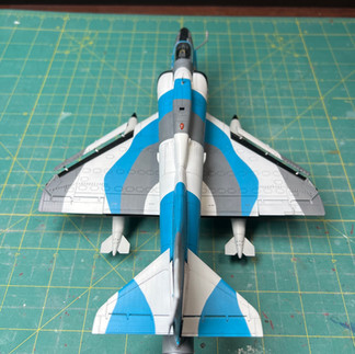 And with that, the Skyhawk was complete. This was a really nice kit. It went together well, without need of much filler or fettling. Well, other than the multi part nose cone, which was clearly intended to be displayed open, Closing it up took a fair bit of work. The splinter paint scheme took a lot of masking, and would be approachec differently if another was built. White is difficult to apply, and doesn't cover other colours well. The masking had some bleed through and clean up needed white to be applied over other colours. The white wouldn't cover up the base colour and ended up obscuring some of the fine rivet detail. It would have needed more masking but it would have been better to clean up the bleed through using the colours.