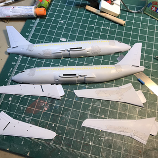 I decided to remove the raised detail from the wings. The Nazca decals include the spoilers, so I filled the kit lines with putty. I then deepened the lines for the leading and trailing edge flaps. I set all the parts aside to dry. Here’s where things sit after a couple hours.